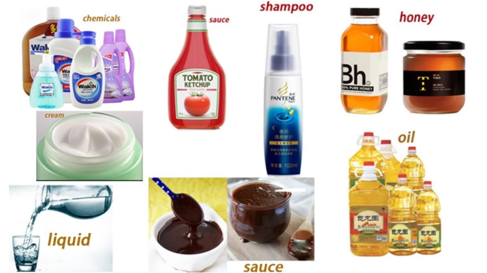 Cairan setengah kental dan kental; saus tomat, mustard, sirup, salsa, mayones, madu, selai kacang, jeli, saus celup, balsam bibir, sampo, sabun tebal, gel styling, masker wajah, lilin, lem, minyak, sealant, silikon dan banyak lagi